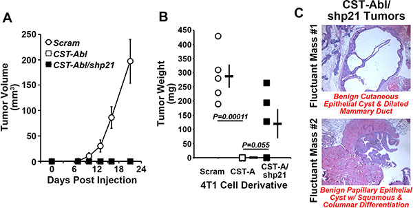 Figure 5: p21-deficiency partially restores the tumorigenicity of CST-Abl-expressing 4T1 cells. (A and B) Parental (i.e., Scram), CST-Abl-, and CST-Abl/shp21-expressing 4T1 cells were engrafted onto the mammary fat pads of Balb/C mice. The resultant tumor growth was measured by digital calipers (A), and by excising and weighing the tumors at the time of necropsy (B). Data are the mean (± SE) tumor volumes (A) and weights (B). (C) H&E staining of paraffin-embedded slices of mammary glands harvested from p21-deficient CST-Abl-expressing 4T1 tumors.