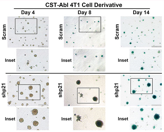 Figure 6: CST-Abl expression abrogates 4T1 tumorigenicity by inducing a p21-dependent senescence. CST-Abl-expressing 4T1 cells were transduced with scrambled (i.e., Scram) or p21 shRNA lentiviral particles. Afterward, the 4T1 derivatives were propagated in compliant 3D-cultures for 4–14 days, at which point they were fixed and stained for β-galactosidase expression. Photomicrographs are representative of 2 independent experiments.