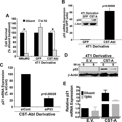 Figure 7: c-Abl induces p21 expression via a TGF-β1 dependent reactivation of p53 expression in 4T1 cells. (A) NMuMG, parental 4T1 (i.e., GFP), and CST-Abl-expressing 4T1 cells were incubated with 6-thioguanine (6-TG) for 72 h. Data are the mean (± SE) percentage of surviving cells observed in 3 independent experiments. *P < 0.05. (B) Expression of p53 mRNA and protein (inset) in parental (i.e., GFP) and CST-Abl-expressing 4T1 cells. Data are the mean (± SE) of 3 independent experiments. (C) CST-Abl-expressing 4T1 cells were transiently transfected with nontargeting (i.e., siCont) or p53-targeting siRNA. Differences in p21 expression were determined on day 5 by semi-quantitative real-time PCR. Data are the mean (± SE) of 3 independent experiments. (D) Parental (E.V.) and CST-Abl-expressing (CST-A) 4T1 cells were incubated for 8 h in the absence or presence of SB431542 (10 μM) as indicated, at which point differences in p53 expression were determined by immunoblotting. Data are representative of 2 independent experiments. (E) Parental (E.V.) and CST-Abl-expressing (CST-A) 4T1 cells were grown in compliant 3D-cultures for 60 h in the absence or presence of SB431542 (10 μM). Afterward, p21 mRNA expression was determined by semi-quantitative real-time PCR. Data are the mean (± SD) of 2 independent experiments.