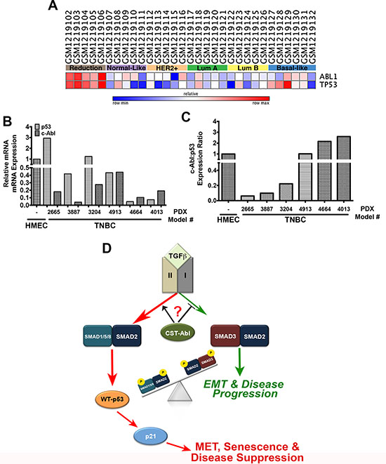 Figure 8: c-Abl and p53 are discordantly expressed in breast cancer. (A) c-Abl and p53 mRNA expression in the indicated NCBI geo datasets was analyzed by GENE-E (www.broadinstitute.org/cancer/software/GENE-E). (B) c-Abl and p53 mRNA expression was determined by semi-quantitative real-time PCR in normal HMEC organoids and TNBC PDX models. (C) The ratio of c-Abl:p53 expression determined in Panels C and D indicate that these tumor suppressors are discordantly expressed TNBC tumors. (D) Representative model highlighting the necessity of c-Abl expression and activity for the induction of MET reprogramming and TNBC tumor suppression, which transpires through an imbalance in activation of pSmad2:pSmad1/5/8 relative to that of pSmad3 in response to increased autocrine TGF-β1 signaling. Questions remain as to the precise role activated c-Abl plays in driving the imbalances in Smad activation by TGF-β.