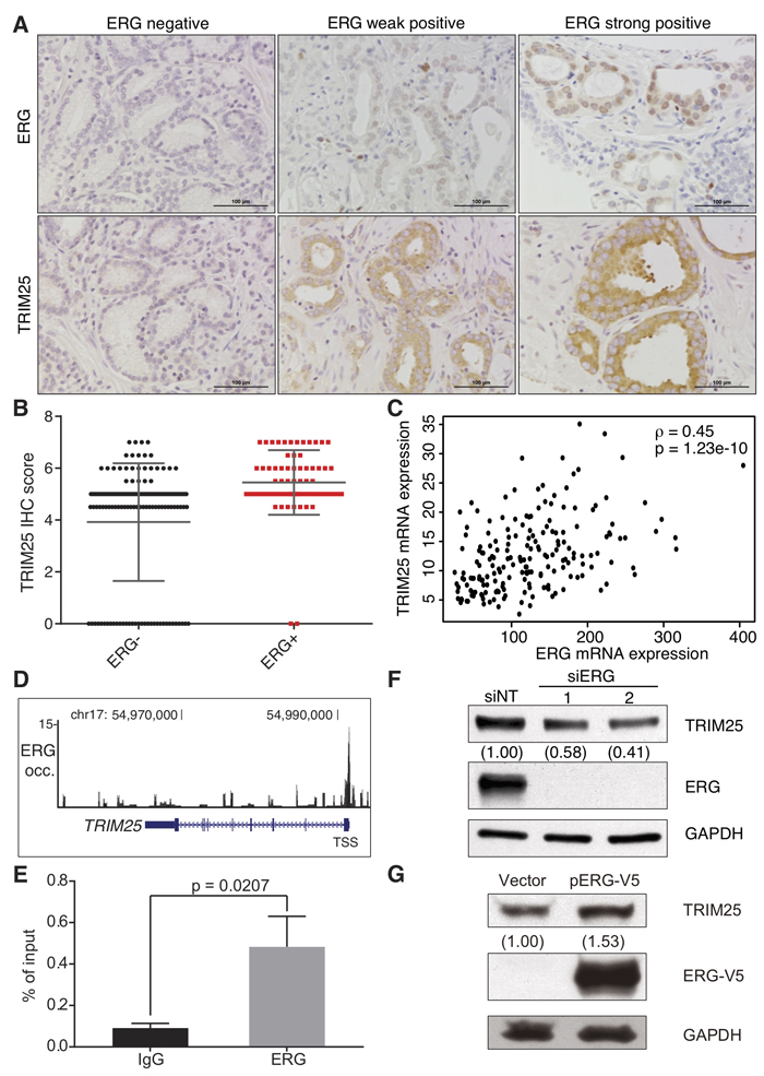 Figure 4: ERG is a positive transcriptional regulator of TRIM25 expression in prostate cancer. A., B. Analysis of TRIM25 and ERG protein expression by immunohistochemical (IHC) analysis in a tissue microarray of 209 prostate cancer specimens. Slides were stained for TRIM25, ERG and hematoxylin, and representative images are shown for specimens with variable staining intensities for ERG and TRIM25 A.. Scale bars are 100 μm. TRIM25 protein levels are significantly higher in the 70 ERG-positive samples than in the 139 ERG-negative samples (p = 3.89e-07, Student’s t-test) B.. C. Paired TRIM25 and ERG mRNA expression of 193 ERG-positive prostate cancer samples from TCGA (ρ - Spearman’s correlation coefficient). D., E. ERG occupancy is markedly increased at the transcription start site (and putative promoter region) of TRIM25, as depicted in the UCSC Genome Browser for ERG ChIP-seq data D.. The y axis depicts ChIP-seq read density, which reflects ERG occupancy. We validated the ChIP-seq data experimentally by ChIP-qPCR analysis of ERG occupancy at the TRIM25 promoter in VCaP cells E. (n = 3, p value - t test, error bars represent s.d.). F. ERG knockdown in VCaP cells results in reduced TRIM25 expression. Cells were transfected with siRNAs against ERG or a non-targeting control siRNA (siNT), and immunoblotting for ERG, TRIM25, and GAPDH was performed 72 hours after transfection. G. Ectopic expression of ERG-V5 in 22Rv1 cells results in increased TRIM25 expression. 22Rv1 cells were transfected with an ERG-V5 expression vector or the empty vector, and selected for stable expression with geneticin. Cells were analyzed by immunoblot analysis for TRIM25, ERG-V5, and GAPDH expression. For densitometric analysis of immunoblots GAPDH was used for normalization.