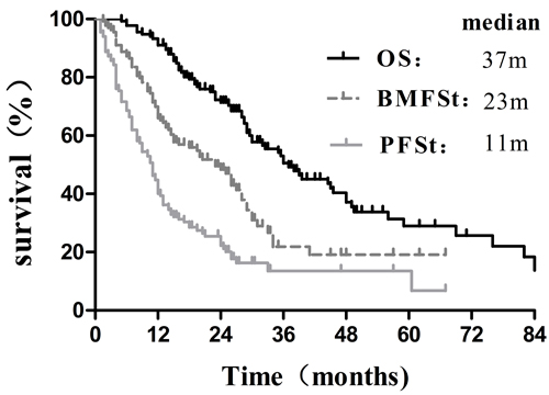 Figure 1: Overall survival, Brain-metastasis-free survival of TKIs and Progression-free survival of TKIs for 134 patients with EGFR-mutated advanced lung adenocarcinoma.