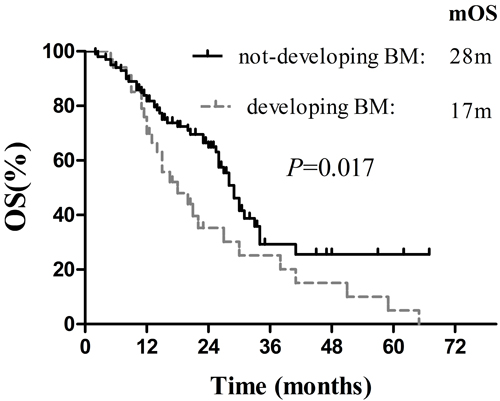 Follow-up was completed in all 134 patients until December 2015, and the median follow-up period was 38.0months (range: 4.0-91.3 months). At the end of follow-up, 41 patients (30.6%) were still alive, whereas 93 patients (69.4%) had died. For these patients, median OS, median BMFSt and median PFSt were 37.0 months (95% CI: 27.1-46.9 months), 23.0 months (95% CI: 17.4-28.6 months) and 11.0 months (95% CI: 9.4-12.6 months), respectively (Figure 1). Additionally, the survival in these patients who didn’t develop BM was significantly superior to that in patients who developed BM (p = 0.017, Figure 2), according to the calculation from the date of starting EGFR-TKIs treatment.