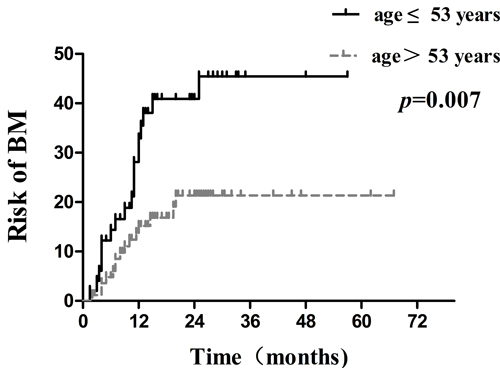 Figure 3: Comparison of the actuarial risk for developing BM between age > 53 years and age ≤ 53 years.