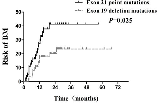 Figure 4: Comparison of the actuarial risk for developing BM between exon 21 point mutations and exon 19 deletion mutations.