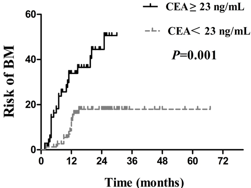Figure 5: Comparison of the actuarial risk for developing BM between serum CEA ≥ 23 ng/mL and serum CEA < 23 ng/mL.