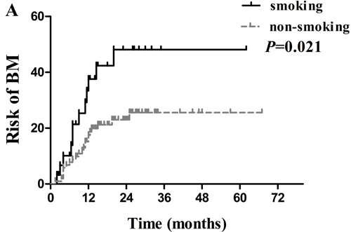 Figure 6: Comparison of the actuarial risk for developing BM. A. between smoking and non-smoking; B. among patients with EGFR-TKIs first-line treatment, second-line treatment, and third-line or multi-line treatment.