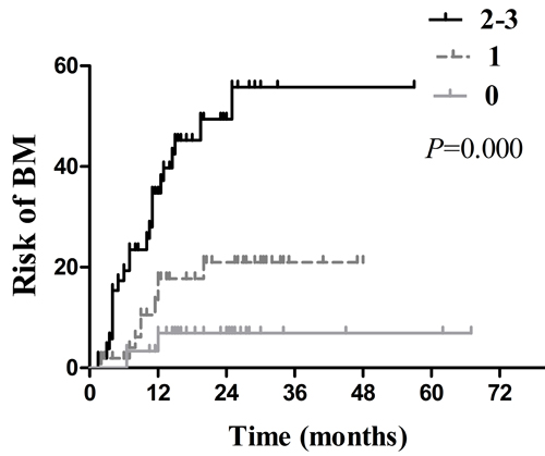 Figure 7: Comparison of the actuarial risk for developing BM among patients with different numbers of risk factors.