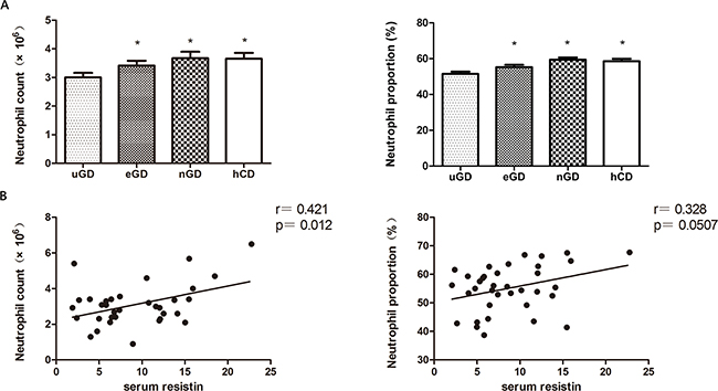 Figure 2: The correlation of serum resistin with neutrophil counts. A. Circulating neutrophils counts and proportion in uGD, eGD, nGD and hCD. B. The serum resistin level in uGD patients is positive correlated with circulating neutrohpils. * P<0.05.