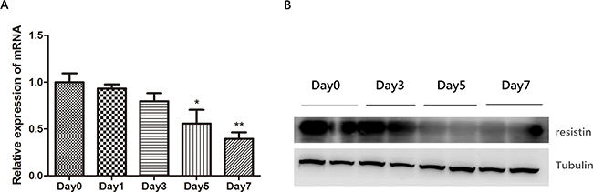 Figure 3: The effect of thyroid hormone T3 (100ng/ml) on resistin expression in neutrophil cell line NB4. The mRNA A. and protein B. expression of resistin in NB4 is suppressed upon T3 treatment in a time-dependent manner.*: compared with Day0. * P<0.05* * P<0.01.