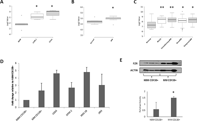Figure 1: FZR1 expression levels in MM. A. FZR1 gene expression in normal bone marrow (NBM ; n=4), OPM-2 (n=4) and U266 (n=3) MM cell lines; GSE78884. B. FZR1 gene expression in CD138+ cells from normal donors (n=5) and MM patients (n=12); data from published dataset GSE6477. C. FZR1 expression in CD138+ from normal donors (n=16), monoclonal gammopathy of undetermined significance (MGUS; n=22), smoldering MM (n=24), newly diagnosed MM (n=72) and relapsed MM (n=27); data from published dataset GSE6691. D. qPCR expression of FZR1 in CD138+ cells from healthy donors (n=3), MM patients (n=5) and 4 MM cell lines (U266, OPM-2, KMS-18, JJN3; n=3). E. Western blot analysis of FZR1 expression in CD138+ cells from NBM, MM patients and MM cell lines. Densitometry analysis is expressed as relative density corrected to loading control. * p ≤ 0.05, ** p ≤ 0.01 (t-test).