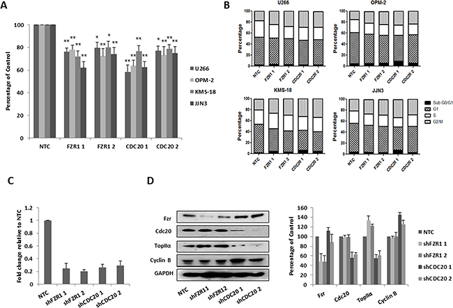 Figure 2: Knockdown of FZR1 and CDC20 reduces viability and induces cell cycle arrest. A. MM cell lines were transduced with two different shRNA constructs against FZR1 or CDC20, viability of MM cell lines was measured 48 hrs post-puromycin selection. Results shown represent the mean of 3 independent experiments and are expressed as a percentage of cells transfected with non-targeting control (NTC) shRNA. B. Cell cycle analysis of propidium iodide stained cells 48 hrs post-transduction with shFZR1 or shCDC20. Results shown represent the mean of 3 independent experiments. C. q-PCR analysis of FZR1 and CDC20 gene expression in U266 cells 48 hrs post-transduction. Results shown represent the mean of 3 independent experiments and are expressed as fold-change relative to NTC. D. Protein expression of Fzr, Cdc20 and their respective substrates TopIIα and Cyclin B in U266 cells 48 hours post-transduction. Densitometry analysis is expressed as a percentage of NTC corrected to loading control. * p ≤ 0.05, ** p ≤ 0.01 (t-test).