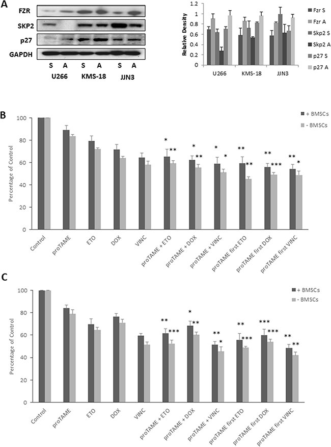 Figure 5: BMSC adhesion results in increased Fzr expression. A. Fzr, Skp2 and p27 protein expression in U266, KMS-18 and JJN3 cells cultured in suspension (S) or adhered (A) to HS-5 stromal cell line. Densitometry analysis is expressed relative to loading control. B & C. U266 (B) and JJN3 (C) grown with and without primary BMSCs from 3 different MM patients and treated with 10 µM proTAME in combination with 1 µM etoposide (ETO), 100 nM doxorubicin (DOX) or 10 µM vincristine (VINC). Drugs were combined either simultaneously or first pre-treated with proTAME for 8 hrs. Proliferation was assessed 48 hrs post-treatment and results are expressed as a percentage of vehicle treated control. * p ≤ 0.05, ** p ≤ 0.01, *** p ≤ 0.001 (one-way ANOVA).