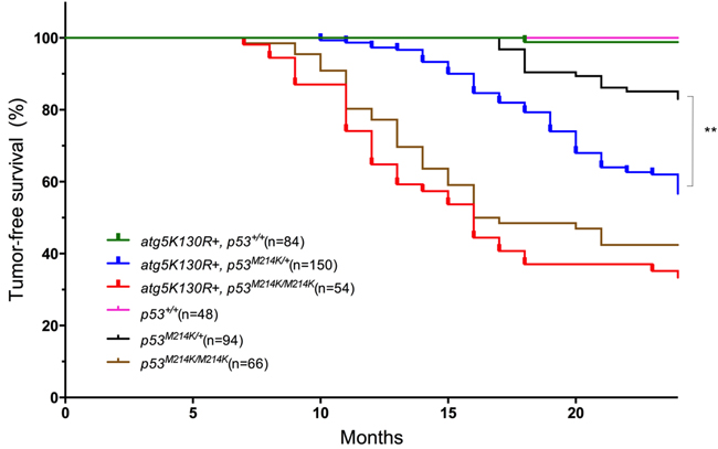 Figure 2: Atg5K130R accelerates tumor development in the p53-mutant background. Tumor-free survival for each indicated fish genotype is shown. Numbers in parentheses indicate total number of animals observed per genotype. **p < 0.001 for Tg(mitfa:atg5K130R); p53M214K/+ vs non-transgenic tp53M214K/+ (Log-rank (Mantel-Cox) test).