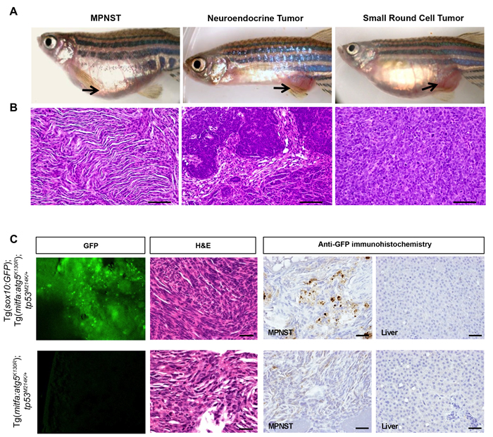 Figure 3: MPNSTs arising in Tg(mitfa:atg5K130R); tp53M214K/+ fish express sox10. A.-B. Representative photomicrographs of gross macroscopic appearance of tumors A. and hematoxylin and eosin (H&E) stained microscopic sections of corresponding tumors B. in Tg(mitfa:atg5K130R); tp53M214K/+ fish. MPNST, malignant peripheral nerve sheath tumor. Scale bars, 50 μm. See Table 1 for details of numbers of fish with each tumor type. C. Representative confocal images to detect GFP expression, H&E staining, and anti-GFP immunoperoxidase staining of an MPNST from a Tg(mitfa:atg5K130R); Tg(sox10:EGFP); tp53M214K/+ fish (top) and an MPNST from a GFP-negative control Tg(mitfa:atg5K130R); tp53M214K/+ (bottom). Liver is shown for the anti-GFP immunoperoxidase staining as a representative non-tumor tissue (right panels). Scale bars, 100 µm.