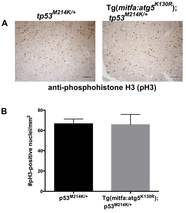 Figure 4: Cell proliferation rates are equivalent in MPNSTs from atg5K130R transgenic and non-transgenic p53-deficient fish. A. Anti-phosphohistone H3 immunohistochemistry of tp53M214K/+ and Tg(mitfa:atg5K130R); tp53M214K/+ fish. B. Quantification of staining. Mean +/- SEM of 5 tumors per genotype is shown.