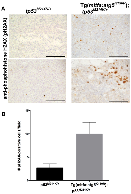To further probe the mechanism of increased tumor incidence in Tg(mitfa:atg5K130R);tp53M214K/+ fish, we considered whether inhibition of autophagy in neural crest lineage cells caused genome instability. Previous studies have shown that cells deficient in autophagy exhibit chromosome instability manifested by increased DNA damage, gene amplification, and aneuploidy [47, 48]. Irradiated glioblastoma cells in which autophagy is inhibited displayed more pronounced and prolonged foci of phosphohistone H2AX, a marker of DNA double-strand breaks [49]. To test whether inhibition of autophagy caused elevated levels of DNA damage in the transgenic fish, we stained MPNSTs from Tg(mitfa:atg5K130R);tp53M214K/+ and tp53M214K/+ heterozygous mutants with a validated antibody specific for the phosphorylated form of Histone H2AX (pH2AX) [50]. Tumors arising in fish with the mitfa:atg5K130R transgene exhibited significantly higher numbers of pH2AX foci (Figure 5). Thus, inhibition of autophagy was associated with increased generation and/or persistence of double-strand DNA breaks in Tg(mitfa:atg5K130R);tp53M214K/+ tumors.