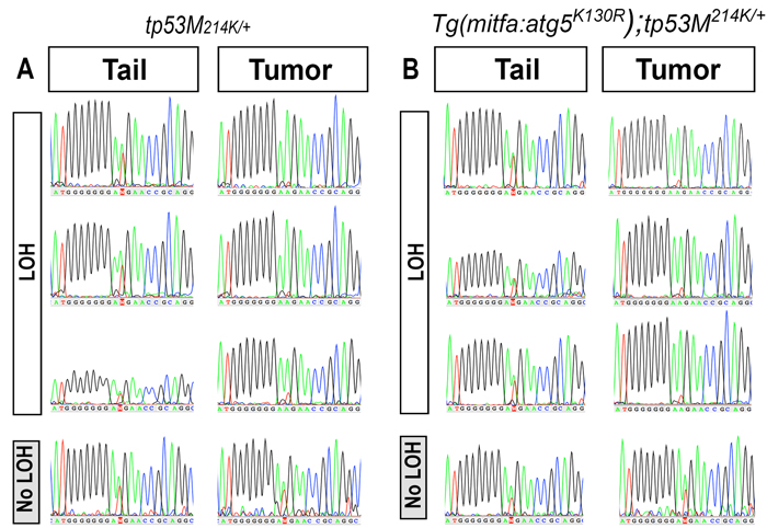 We did not observe tumors in fish that stably express Atg5K130R in a tp53 wild-type background. Since increased tumor incidence due to Atg5K130R expression was only detected in a tp53 heterozygous mutant background, we hypothesized that expression of Atg5K130R might affect the function or expression of tp53. tp53 functions as a homotetramer in cells, and the defective apoptosis phenotype of heterozygous tp53M214K/+ mutant fish was found to be intermediate compared to that of the homozygous tp53M214K/M214K mutant fish, implying that the total cellular level of p53 protein is functionally important [36]. We also noted that the tumor incidence in Tg(mitfa:atg5K130R);tp53M214K/+ fish resembles that of p53 homozygous tp53M214K/M214K mutant (non-transgenic) fish, with a slightly later onset. TP53 loss of heterozygosity (LOH) frequently occurs during the development of human cancers, including MPNSTs [51-55]. The elevated incidence of DNA damage in Tg(mitfa:atg5K130R);tp53M214K/+ MPNSTs prompted us to test the incidence of tp53 LOH in these tumors (Figure 6). Pair-matched tumor and normal tissue genomic DNA was prepared from the individual tumor-bearing fish, and a fragment of the tp53 gene containing the M214K mutation was PCR-amplified and sequenced. LOH of tp53 occurred in > 70% of tumors from both Tg(mitfa:atg5K130R);tp53M214K/+ and non-transgenic tp53M214K/+ fish [22/30 (73.3%) of tumors from Tg(mitfa:atg5K130R);tp53M214K/+ and 7/10 (70%) of tumors in heterozygous tp53M214K/+ fish (70%)] (representative sequences are shown in Figure 6). Given the significantly shortened latency of tumorigenesis in the Tg(mitfa:atg5K130R); tp53M214K fish, these data suggest that inhibition of autophagy by the expression of Atg5K130R may accelerate LOH of p53. These results further suggest a possible role for autophagy in tumor suppression by regulating LOH of tumor suppressor genes.