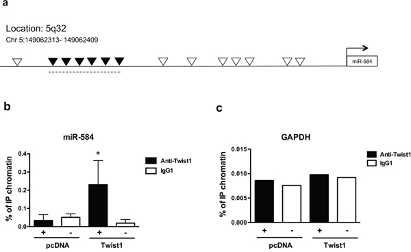 Figure 2: TWIST1 directly binds a region upstream of miR-584. a. Schematic representation of all E-box binding sites (indicated as ∇) in the genomic locus of miR-584. Black ▼ indicate the E-boxes amplified in ChIP assays. b. ChIP assay, followed by qRT-PCR, was performed with TPC-TWIST1 or control (pcDNA) cells. Columns represent the average of four independent experiments □± SD. * p< 0.05. c. The amplicon of the GAPDH promoter was used as a negative control. The figure represents four independent experiments.