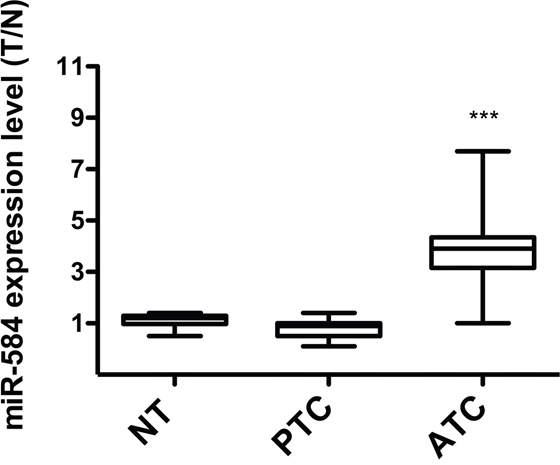 Figure 3: Expression of miR-584 in thyroid tissue samples. qRT-PCR analysis of miR-584 in normal thyroid (NT) (n=10), PTC (n=11), and ATC (n=6) snap-frozen tissue samples. The expression level of miR-584 was normalized to the U6 snRNA levels. The level of miR-584 in each sample was measured by comparing its fluorescence threshold with the average fluorescence threshold of the NT samples. The average results of quadruplicate experiments are plotted. ***, p< 0.001.
