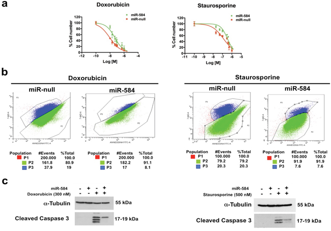 Figure 4: Effects of ectopic expression of miR-584 in TPC cells. a. TPC miR-584 and TPC miR-null cell lines weretreated with different doses of doxorubicin and staurosporine for 48 and 24 hours, respectively, and counted in triplicate. The IC50 values were calculated with GraphPad software. The average of three independent experiments ± SD is shown. b. Dual staining of apoptotic cells with 7-AAD and Annexin V after treatment with doxorubicin and staurosporine. The percentages of apoptotic cells (P3) or of viable cells (P2) are indicated. c. TPC miR-584 and TPC miR-null cells were treated with 300 nM of doxorubicin or with 500 nM of staurosporine, lysed after 48 and 24 hours, respectively, and blotted with the antibodies for Cleaved CASPASE 3 or α-TUBULIN.