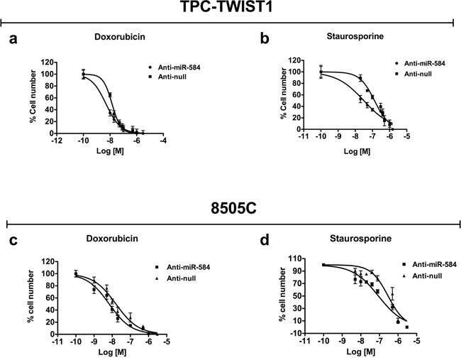Figure 5: Effects of silencing of miR-584 in TPC-TWIST1 and 8505C cells. The indicatedcells were treated with increasing doses of doxorubicin or staurosporine and counted after 48 and 24 hours, respectively. Values represent the average of four independent experiments ± SD.