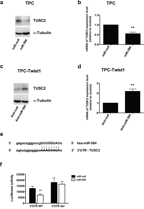 Figure 6: TUSC2 is a direct target of miR-584. a. Immunoblotting of TUSC2 and α-TUBULIN in TPC miR-584 or control cells. b. qRT-PCR of TUSC2 in TPC miR-584 or control cells; data were normalized to the level of POLR2A assuming that the value of TPC miR-null is equal to 1. c. Immunoblotting of TUSC2 and α-TUBULIN in TPC-TWIST1 anti-miR-584 or control cells. d. qRT-PCR of TUSC2 in TPC-TWIST1 anti-miR-584 or control cells. e. Predicted duplex formation between human 3′UTR-TUSC2 and miR-584;the strikethrough sequence of 3′UTR of TUSC2 corresponds to the predicted binding site of miR-584 deleted in the mutant 3′UTR-TUSC2 plasmid (3′UTR del). f. Luciferase activity of TUSC2 wild-type (3′UTR WT) or deleted (3′UTR del) reporter genes in TPC cells stably transfected with miR-584 or control. Luciferase activity was normalized with a co-transfected β-actin plasmid. **, p< 0.01.