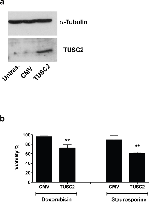 Figure 7: TUSC2 partially rescues the phenotype induced by miR-584. a. TPC miR-584 cells were transiently transfected with TUSC2 plasmid or with the vector control (CMV) and analyzed for TUSC2 protein expression by Western blotting. An antiα-TUBULIN antibody was used for normalization. b. TPC miR-584 cells were transfected with TUSC2 or vector controlandtreated with 50 nM of doxorubicin and 300 nM of staurosporine; after 48 and 24 hours, respectively, cells were stained with trypan blue and counted in triplicate. The percentage viability± SD is shown, **, p < 0.01.