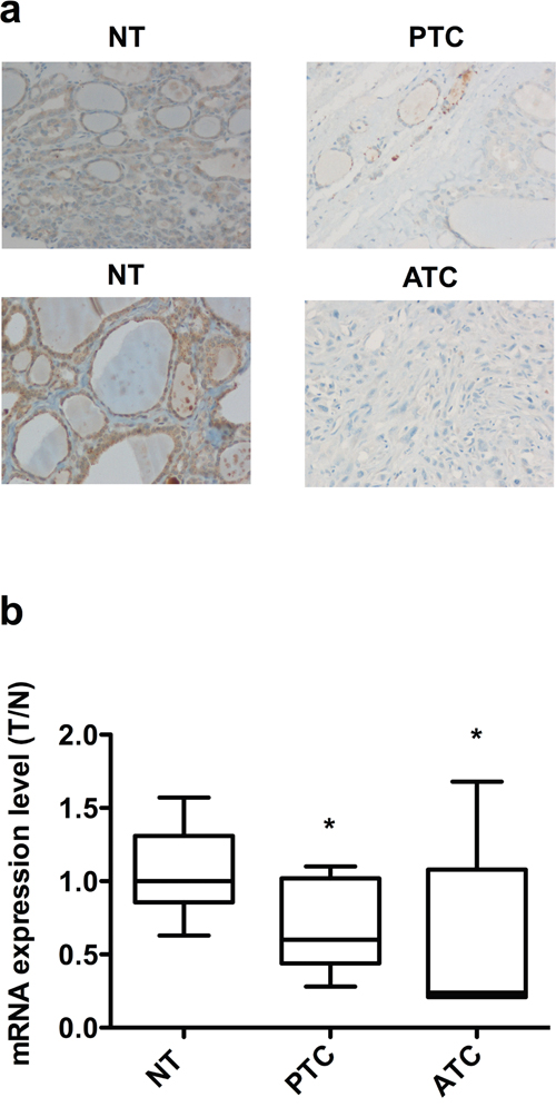 Figure 8: Expression of TUSC2 in thyroid tissue samples. a. Immunohistochemical analysis of TUSC2 protein expression in normal and malignant thyroid tissues. Representative sections (20X magnification) of PTC, ATC and contralateral NT stained with an anti-TUSC2 antibody are shown. b. qRT-PCR of TUSC2 in NT (n=10), PTC (n=11) and ATC (n=6) snap-frozen tissue samples. The expression level of TUSC2 in each sample was measured by comparing its fluorescence threshold with the average fluorescence threshold of the NT samples. The average results of quadruplicate samples are plotted. The expression level in each sample was normalized with the β-Actin measurement. * p< 0.05.