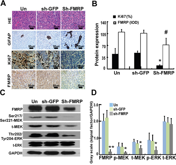 Figure 7: FMRP expression correlates to Ki67 expression and MEK/ERK signaling pathway in vivo. A. Representative microscopy images showing sections of orthotopic tumors from mice, stained with H&E or immunostained for GFAP, Ki67, or FMRP. The xenograft tumors were derived from U251 cells either infected or not with lentivirus vector carrying GFP-shRNA or FMRP-shRNA. B. IOD analysis for the expressions of Ki67 and FMRP in xenograft tumors, derived from U251 cells that were either transfected or not with GFP-shRNA or FMRP-shRNA. Values are presented as the mean ± SD (n=13 for each group). *, # P<0.05 vs. non-transfected or GFP-shRNA transfected mice. C. Western blot analysis of FMRP, Ser217/Ser221-MEK, Thr202/Tyr204-ERK, total MEK, and total ERK. D. Quantification of C. Values are presented as the mean ± SD (n=5 for each group). *P<0.05, **P<0.01 vs. non-transfected (Un) or GFP-shRNA transfected (sh-GFP) group.