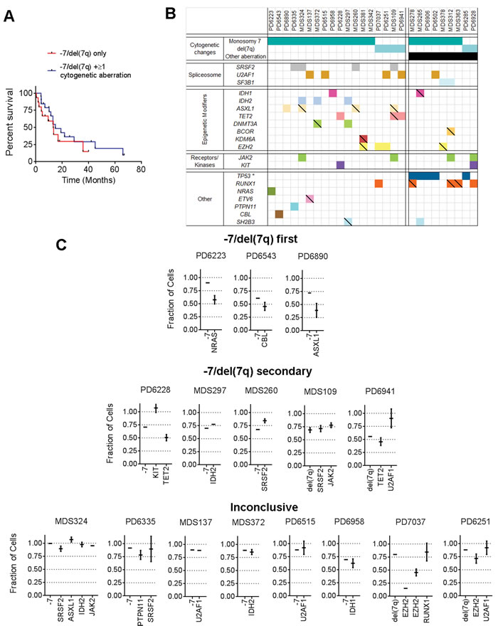 Figure 1: Co-occurrence of chromosome 7 abnormalities and recurrent driver mutations. A. Survival (Kaplan Meier) after diagnosis of MDS patient cohort with chromosome 7 abnormalities grouped as -7/del(7q) only (n = 15); or as -7/del(7q) + ≥ 1 cytogenetic aberration (n = 20). B. Co-occurrence map of -7 and del(7q) with oncogenic mutations (empty boxes) and truncating/unknown mutations (hatched\scored boxes) as described in supplementary methods. C. Computational prediction of fraction of cells with specified genetic lesions, within total BM mononuclear cells from patients with isolated -7 or isolated del(7q). Patients were grouped based on predicted hierarchy of genomic lesions. Error bars indicate 95% confidence interval (CI).