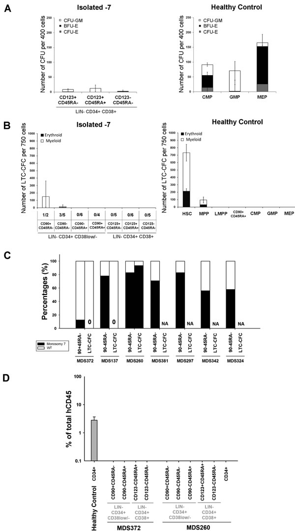 Figure 3: Functional assessment of stem and progenitor cells in isolated monosomy 7 MDS. A. Mean (SEM) colony forming activity from indicated stem/progenitor cell populations from isolated -7 patients (n = 7) and HC (n = 6). Mean (SEM) burst forming unit-erythroid (BFU-E), CFU-erythroid (CFU-E) and CFU-granulocyte/monocyte (CFU-GM) based on colony morphology. B. Mean (SEM) LTC-CFC activity of indicated cell populations from isolated -7 (n = 6) and HC (n = 5). For isolated -7 MDS, the frequency of patients with readout is indicated below the x-axis for each population. C. Percentages of sorted stem cells and LTC-CFCs derived from LIN-CD34+CD38-CD90+CD45RA- or LIN-CD34+CD38low/-CD90-CD45RA- cells with (black) and without (white) -7 karyotype as detected by FISH. 10, 8 and 16 LTC-CFC colonies were picked and analysed for MDS372 MDS137 and MDS260, respectively. NA = Not applicable as no LTC-CFC readout D. Mean (SEM) human CD45+ engraftment in NSG mice 5 months after transplantation of CD34-enriched cells (CD34+) from one HC and indicated populations from 2 isolated -7 patients. Three NSG mice were used per sorted population.