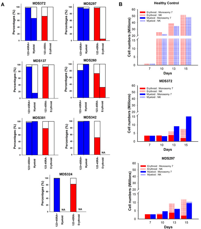 Figure 4: Myeloid and erythroid differentiation potential of progenitors harboring monosomy 7. A. Percentages of nuclei, with (colored) and without (white) -7 karyotype as identified by FISH in phenotypically defined myeloid (LIN-CD34+CD38+CD123+CD45RA+) or megakaryocyte-erythroid (LIN-CD34+CD38+CD123-CD45RA-) progenitor cells and individually picked Myeloid or Erythroid colonies, respectively, derived from these progenitor cells. A minimum of 8 colonies were analysed from each patient. NA = not applicable as no colony formation. B. Absolute number of cells with and without -7 karyotype as assessed by FISH ( > 300 cells counted) at indicated time points during myeloid (blue) or erythoid (red) cell suspension cultures of CD34+ cells. Data on y axis presented in split graphs.