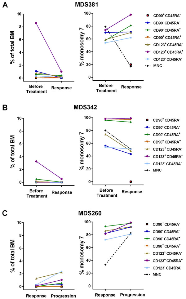 Figure 5: Monosomy 7 clonal involvement of stem and progenitor cell populations during azacitidine treatment. Frequencies of distinct stem and progenitor cells within total BM mononuclear cells and -7 clonal involvement as determined by FISH, before and during azacitidine treatment for three isolated -7 patients. A. Patient MDS381 before treatment and at response after 6 cycles of azacitidine treatment. B. Patient MDS342 before treatment and at response after 1 cycle of azacitidine. C. Patient MDS260 at response after 10 cycles of azacitidine and at progression after 16 cycles of azacitidine. MNC = Mononuclear Cells.