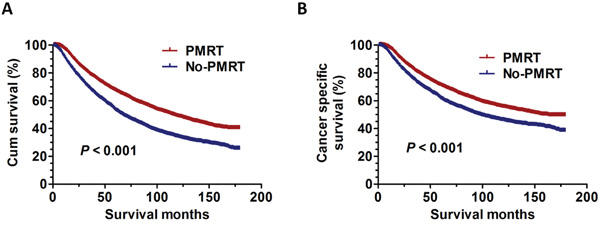 Figure 1: The survival curves in breast cancer patients with PMRT and No-PMRT between 1998 and 2001. A. The OS curves: (χ2=186.4, P < 0.001). B. The CSS curves (χ2=74.8, P < 0.001).