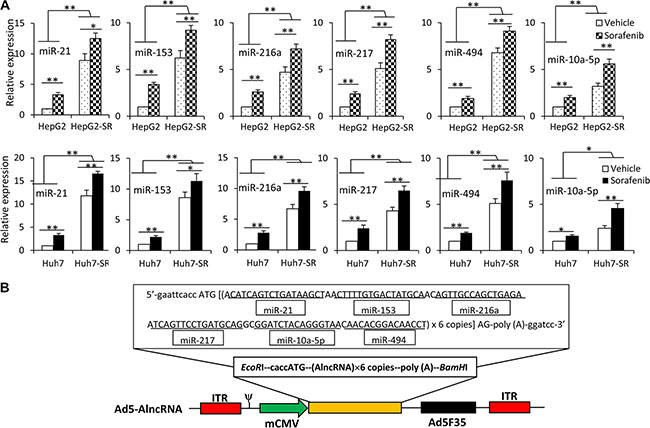 Figure 1: Exposure to sorafenib induces upregulation of multiple miRNAs. (A) HepG2, HepG2-SR, Huh7 and Huh7-SR cells were incubated with sorafenib (2.5 μM) for 96 h, and then the expression of miRNAs was measured by real-time RT-PCR. The level of miRNA from untreated parental cells was defined as 1. “*” (P < 0.05) and “**” (P < 0.001) indicate a significant difference. (B) Schematic diagram of Ad5-AlncRNA. The expression cassette of whole-length encoding sequence of AlncRNA was inserted into the EcoRI/BamHI sites of adenovirus E1 region, to generate the recombinant adenovirus Ad5-AlncRNA. ITR, inverted terminal repeats; ψ, adenovirus 5 packaging signal; mCMV, mouse cytomegalovirus promoter.