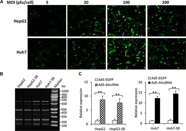Figure 2: Expression of AlncRNA in HCC cells after Ad5-AlncRNA infection. (A) HepG2 and Huh7 cells were infected with Ad5-EGFP at MOIs of 10, 20, 100 and 200 pfu/cell for 3 h, and then observed under fluorescent microscopy. (B, C) HepG2, HepG2-SR, Huh7 and Huh7-SR cells were infected with Ad5-AlncRNA at an MOI of 100 pfu/cell for 3 h. Cells were harvested and subjected to conventional RT-PCR and PCR products were electrophoresed (B), or real-time PCR to quantify the expression of AlncRNA (C). “**” (P < 0.001) indicates a significant difference.