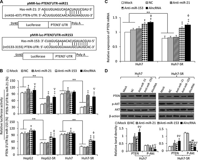 Figure 3: AlncRNA increases PTEN expression and inhibits AKT phosphorylation by targeting miR-21 and miR-153. (A) Predicted paring of miR-21 (or miR-153) to the 3′-UTR of the human PTEN gene, and the diagram of a pMIR-REPORT luciferase reporter vector containing the 3′-UTR of PTEN with miR-21 (or miR-153) seed site (pMIR-luc-PTEN3′UTR-miR21 or pMIR-luc-PTEN3′UTR-miR153). (B) Luciferase activities in HepG2, HepG2-SR, Huh7 and Huh7-SR cells transfected with pMIR-luc-PTEN3′UTR-miR21, pMIR-luc-PTEN3′UTR-miR153 or a control vector. Cells were mock co-transfected or co-transfected with negative control (NC), anti-miR-21 or anti-miR153 oligonucleotides, or infected with AlncRNA. Relative luciferase activity was calculated as the percentage of luciferase activity in luciferase reporter vectors -transfected cells over those with the control vector. (C, D) Huh7 and Huh7-SR cells were mock transfected or transfected with NC, anti-miR-21, anti-miR153 or AlncRNA. Twenty-four hours later, cells were subjected to real-time RT-PCR to measure PTEN mRNA expression (C), or immunoblotted for detecting protein expression (D). The density of each band was measured and normalized to respective β-actin. “**” (P < 0.001) indicates a significant difference. “†” (P < 0.05) and “‡” (P < 0.001) indicate a significant increase; while “#” (P < 0.05) and “##” (P < 0.001), a significant reduction, versus mock transfected cells. “f” (P < 0.05) indicates a significant difference from anti-miR-21-transfected cells, while “Ñ” (P < 0.05), from anti-miR-153-transfected cells.