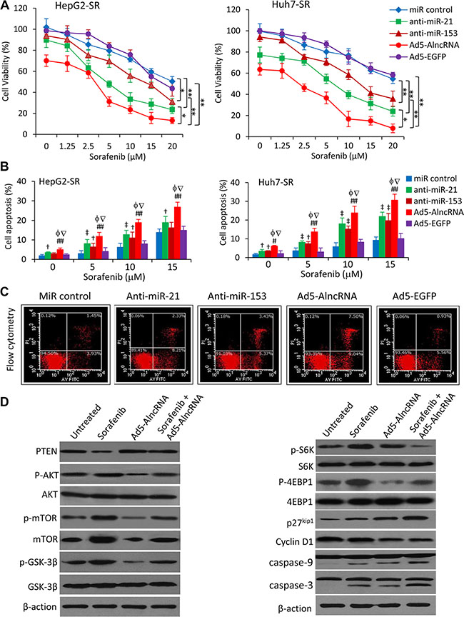 Figure 4: AlncRNA enhances the effects of sorafenib-induced growth inhibition and apoptosis in sorafenib-resistant HCC cells. (A) HepG2-SR or Huh7-SR cells transfected with miRNA negative control, anti-miR-21 or anti-miR-153 oligonucleotides, or infected with Ad5-AlncRNA or Ad5-EGFP, were incubated with serial concentrations of sorafenib for 48 h. Cell viability (%) was measured and normalized with the corresponding untreated cells. (B) The above cells incubated with sorafenib (0, 2.5, 5 or 10 μM) for 48 h were analyzed to measure apoptosis rates (%). (C) Representative dot plots were from the above cytometrically analyzed Huh7-SR cells incubated with sorafenib (5 μM). (D) Huh7-SR cells untreated or incubated with sorafenib (5 μM), or infected with Ad5-AlncRNA, or the combination for 48 h. Cells were then subjected to immunoblotting. “*” (P < 0.05) and “**” (P < 0.001) indicate a significant difference. “†” (P < 0.05)and “‡” (P < 0.001) indicate a significant increase from miR control-treated cells. “#” (P < 0.05) and “##” (P < 0.001) indicate a significant increase from Ad5-EGFP-infected cells. “f” (P < 0.05) indicates a significant difference from anti-miR-21-transfected cells, while “Ñ” (P < 0.05), from anti-miR-153-transfected cells.