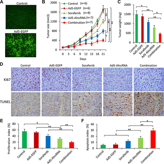 Figure 6: AlncRNA enhances the efficacy of sorafenib to suppress sorafenib-resistant tumors in vivo. Subcutaneous tumors were established in mice, which received different treatments for 21 days as described in MATERIALS AND METHODS. (A) Illustrated are representative fluorescence microscopy-viewed tumor sections from vehicle and Ad5-EGFP-treated mice prepared 10 days after commencement of treatments. (B) The sizes of tumors were recorded. (C) Tumors were excised and weighed at the end of experiments. (D) Sections of tumors were stained with an anti-Ki67 Ab (upper panel, magnification ×100) or TUNEL (middle panel, magnification ×200). (E, F) Proliferation index (E) and apoptosis index (F) were quantified. “*” (P < 0.05) and “**” (P < 0.001) indicate a significant difference.