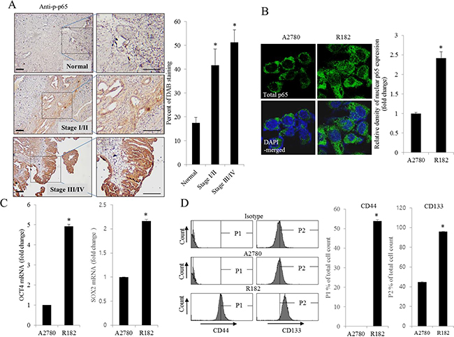 Figure 1: Histological and molecular phenotype of human ovarian cancer. A. Paraffin sections of human ovarian tissues from normal or cancer patients were stained with anti-p-p65 Ab by the immunoperoxidase method as described in the Materials and Methods section (original magnification ×100) (Black scale bar, 0.2 μm). The right panel shows the percentage of p-p65-positive cells measured using HistoQuest tissue analysis software. *A significant difference from the normal group (p< 0.05). B. A2780 cells and R182 cells were stained with an anti-p65 Ab and DAPI before being assessed by confocal microscopy (original magnification ×1800). The right panel shows the relative density of nuclear p65 expression in the cell. *A significant difference from levels in A2780 cells (p< 0.05). C. mRNA levels of OCT4 and SOX2 in A2780 cells and R182 cells were measured using reverse transcription real-time PCR. *A significant difference from levels in A2780 cells (p< 0.05). D. Cellular fluorescence from binding of anti-CD44-FITC Ab and anti-CD133-APC Ab was measured using flow cytometry analysis. *A significant difference from levels in A2780 cells (p< 0.05).