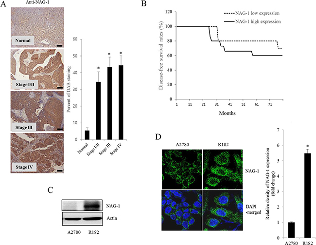 Figure 3: NAG-1 expression in human ovarian cancer and type I EOC cells. A. Paraffin sections of human ovarian tissues from normal or cancer patients were stained with anti-NAG-1 Ab by the immunoperoxidase method as described in the Materials and Methods section (original magnification ×100) (Black scale bar, 0.2 μm). The right panel shows the percentage of cells stained for NAG-1 DAB measured using HistoQuest tissue analysis software. *A significant difference from the normal group (p< 0.05). B. Kaplan-Meier survival analysis of disease-free survival in ovarian cancer patients comparing the low NAG-1 expression group (n=10) and the high NAG-1 expression group (n=15). C. Cellular lysates of A2780 cells and R182 cells were subjected to western blot analysis. D. A2780 cells and R182 cells were stained with an anti-NAG-1 Ab and DAPI before being assessed by confocal microscopy (original magnification ×1800). The right panel shows the relative quantitative values of NAG-1 expression. *A significant difference from A2780 (p< 0.05).
