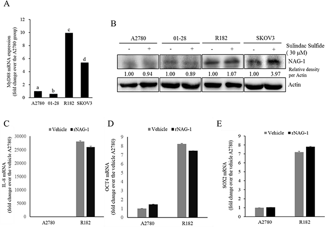 Figure 4: Effects of sulindac sulfide or recombinant NAG-1 (rNAG-1) on NAG-1-linked signals. A. MyD88 mRNA levels in human EOC cell lines (A2780, 01-28, R182, or SKOV3) were measured using reverse transcription real-time PCR. Different letters represent significant difference between two groups (p < 0.05). B. A2780, 01-28, R182 or SKOV3 cells were treated with vehicle or 30 μM sulindac sulfide (S.S) for 48 h. Cellular lysates were subjected to Western blotting analysis. (C-E) A2780 and R182 cells were treated with vehicle or 10 ng/ml rNAG-1 for 24 h. Cellular mRNA levels were measured using reverse transcription real-time PCR.
