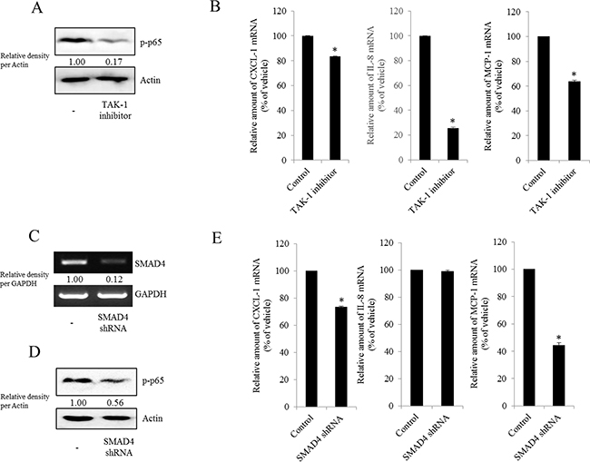 Figure 7: Involvement of TAK-1 and SMAD4 expression in NF-κB-mediated inflammatory responses in type I EOC cells. R182 cells were treated with 2 μM of the TAK-1 inhibitor 5Z-7-oxozeaenol for 4 h. A. Cellular lysates were subjected to western blot analysis. B. mRNA levels were analyzed by reverse transcription real-time PCR. *A significant difference from the control (p< 0.05). (C–E) R182 cells expressing the control vector or SMAD4 shRNA plasmid were compared. C. SMAD4 expression were analyzed using RT-PCR. D. Cellular lysates were subjected to western blot analysis. E. mRNA levels were analyzed by reverse transcription real-time PCR. *A significant difference from the control (p< 0.05).