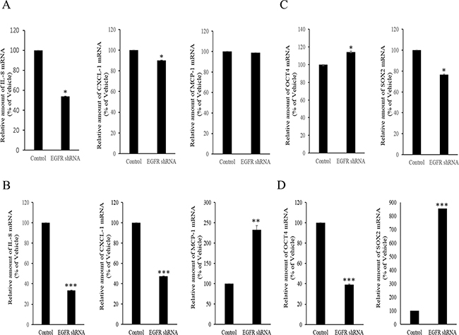 However, the expression of some chemokines was partially down-regulated by the inhibition of either the SMAD- or TAK-1-linked pathways, which indicates the presence of other signals for NAG-1-mediated cytokine induction. In addition to TGFR-II, epidermal growth factor receptor (EGFR) signaling has been known to be affected by members of the TGF-β superfamily [62-64]. We thus assessed the effects of NAG-1 on EGFR signaling cascades in type I EOC cells. Suppression of NAG-1 expression using its shRNA led to a significant inhibition of EGFR expression and its downstream signaling mediator ERK1/2 (Figure 8A and 8B), indicating the positive regulation of cancer EGFR-linked signals by NAG-1. However, the activated EGFR was not involved in NF-κB activation in MyD88-positive ovarian cancer cells (Figure 8C and 8D). In contrast, EGFR contributed to an enhanced production of cancer chemokines such as IL-8 and CXCL-1 in ovarian cancer cells (Figure 9A and 9B). However, expression of MCP-1 was not significantly reduced by EGFR suppression in R182 cells and even elevated in SKOV3 cells. Moreover, actions of EGFR in regulation of cancer stemness markers including OCT4 and SOX2 were not consistent in EOC cells (Figure 9C and 9D). Taken the consistent results, the present results demonstrated that the activation of EGFR was positively associated with the induction of cancer chemokines (IL-8 and CXCL-1) via NF-κB-independent pathways in type I EOC cells.