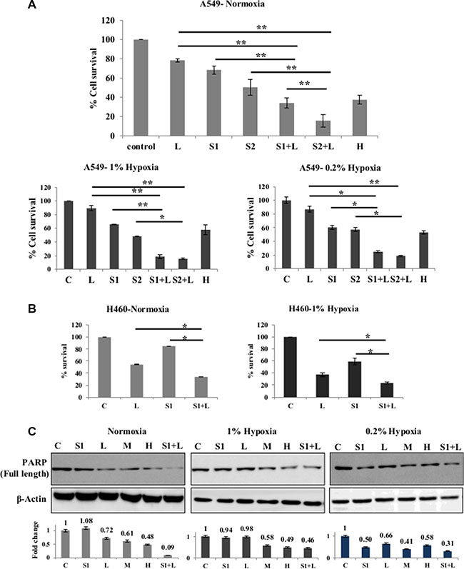 Figure 2: Synergistic effect of combination treatment. (A) Combination of cisplatin and scriptaid at sub-lethal doses showing significantly enhanced cytotoxicity than either of single agent treatment and high dose cisplatin. The combination remained effective in both condition of hypoxia- 1% and 0.2%. (B) MTT assay of H460 cells shows that the combination treatment was significantly more effective than either of the single agent in both normoxic and hypoxic conditions. (C) Cleavage of PARP as seen by western blot analysis as a marker for cell death. High dose cisplatin and combination treatments resulted in greater amount of cell death in all conditions. Graphs represent the fold change in expression of cleaved PARP, normalized with the loading control- β-actin. C= untreated control, L=2μg/ml cisplatin, M= 5μg/ml cisplatin H= 7.5μg/ml cisplatin, S1= 1μg/ml scriptaid, S2= 2μg/ml scriptaid. * indicates p < 0.05, ** indicates p < 0.005.