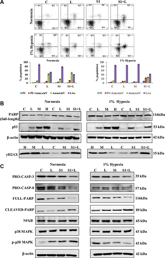 Figure 4: Molecular analysis of cell death and cell signaling markers. (A) AnnexinV-PI dual staining and flow cytometry analysis of lung cancer cells showed elevated levels of apoptotic cell death in combination treatment in normoxia as well as hypoxia. (B) Western blot analysis for DNA damage and cell death markers shows a synergistic improvement in combination treatment compared to low dose single agent treatment. (C) Western blot analysis shows the activation of caspase-mediated apoptosis in response to combination treatment in both normoxic and hypoxic conditions. Q1=necrotic population, Q2=late phase apoptosis, Q3=live cells, Q4= early phase apoptosis. C= control, L=2μg/ml cisplatin M= 5μg/ml cisplatin, S1= 1μg/ml scriptaid.