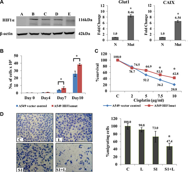 Figure 5: Effects of combination treatment in mutant-HIF1α expressing A549 cells. (A) Confirmation of stable clones was done by western blot analysis using HIF1α specific antibody. Clone B was selected for further experiments. qRT-PCR showed an up-regulation of of HIF1-inducible genes (Glut1 and CAIX) in A549/HIF1 α mut cells. The A549/HIF1α mut cells showed a higher rate of proliferation (B) and resistance to cisplatin (C) compared to A549 cells with wt-HIF1α. (D) Migration assay using Boyden chambers showed a significant inhibition of migration in A549/HIF1mut cells in response to combination treatment than that seen in monotherapy. A= empty vector control; B, C, D, E= different selected clones. C= control, L=2μg/ml cisplatin, S1= 1μg/ml scriptaid. * indicates p < 0.05.