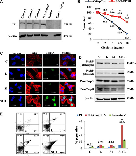 Figure 7: Cell death and DNA damage in response to treatment in A549/p53 dominant-negative cells. (A) Confirmation of stable clones was done by western blot analysis using p53 specific antibody. (B) MTT assay for cisplatin shows that the mutant cell line is resistant to the drug as compared p54-wt A549 cells. (C) Confocal images of A549/p53 dominant negative cells shows an elevated level of DNA damage in combination than single agent treatment. Increased accumulation of γ-H2AX indicates DNA damage. Nucleus= Blue (DAPI), F-actin= Red (TRITC), γ-H2AX= Green (FITC). (D) Western blot analysis shows a caspase mediated cell death in A549/p53 mut cells in response to treatment. (E) AnnexinV-PI dual staining and flow cytometry analysis shows significantly higher apoptosis in combination treatment than low dose cisplatin and scriptaid. Q1=necrotic population, Q2=late phase apoptosis, Q3=live cells, Q4= early phase apoptosis. C= control, L=2μg/ml cisplatin, S1= 1μg/ml scriptaid. * indicates p < 0.05.