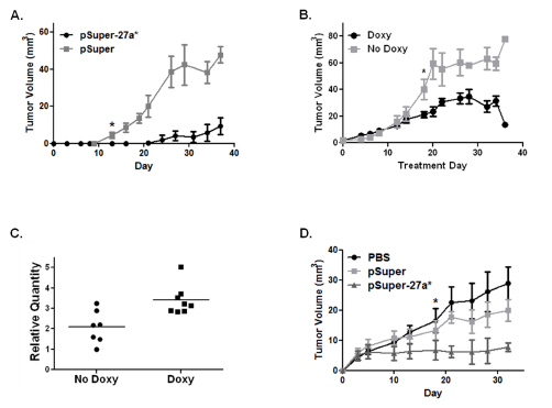Figure 5: miR-27a* expression reduces tumor growth in vivo and direct intratumoral injection reduces tumor growth. (A) Orthotopic xenografts of 22B cells expressing miR-27a* (pSuper-27a*) show reduced growth compared to control vector (pSuper); * at day 16 indicates point at which differences in tumor volume became statistically significant, p<0.05; (B) Tumor growth curve of 22B cells with inducible miR-27a* expression. One group of mice was treated with doxycycline (Doxy) to induce miR-27a* expression after tumors developed (day 0). Tumor volumes were significantly decreased in mice who received doxycycline; * marks day 18 when differences in tumor volumes became statistically significant, p<0.05; (C) Scatter plot depicting a statistically significant increase in miR-27a* RNA collected from murine tumor tissue in the doxycycline group compared to the non-doxycycline group, p<0.01; (D) Direct intratumoral injection significantly reduces growth of 17B tumors in mice treated with pSuper-27a* compared to control and pSuper; * marks day 18 when differences in tumor volumes became statistically significant (p<0.05) for pSuper-27a* compared to the control groups.